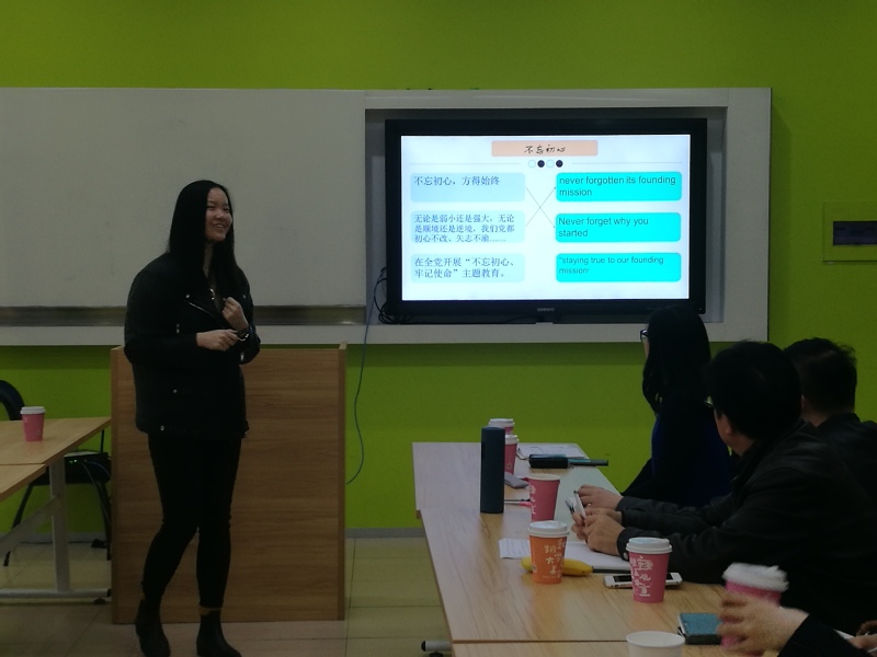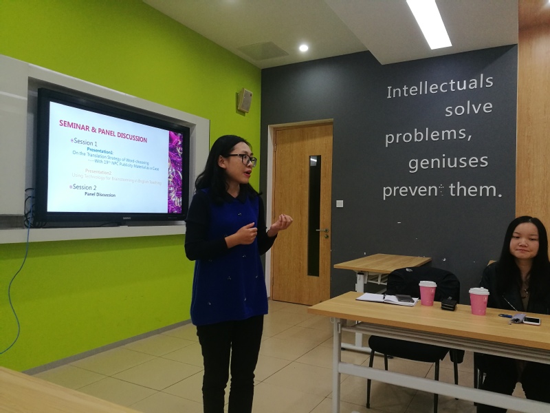 本次教学研共同体活动按国际化的学术研讨会模式,营造了全英文的研讨氛围。首先,以学术研究的角度解读“十九大”报告,创新了思政学习模式。基于平行语料库理论架构,袁琨老师作了报告:On the Translation Strategy of Word-choosing----With 19th NPC Publicity Material as a Case十九大外宣材料的选词策略。各位老师都获益匪浅,既进行了英语专业学术研讨,也学习了“十九大”报告。