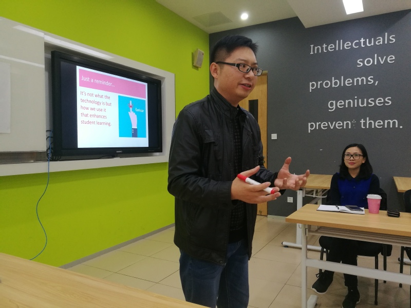 之后,以创新教学手段的角度,王斌老师作了报告:Using Technology for Brainstorming in English Teaching(使用科技手段促进英语教学互动), 汇报了英国培训期间的学习成果,并与全体教师进行了现场实践,现场气氛热烈,大家都认为这既是与国际接轨的教学技术手段研究和实践,也是一堂精彩的观摩课。