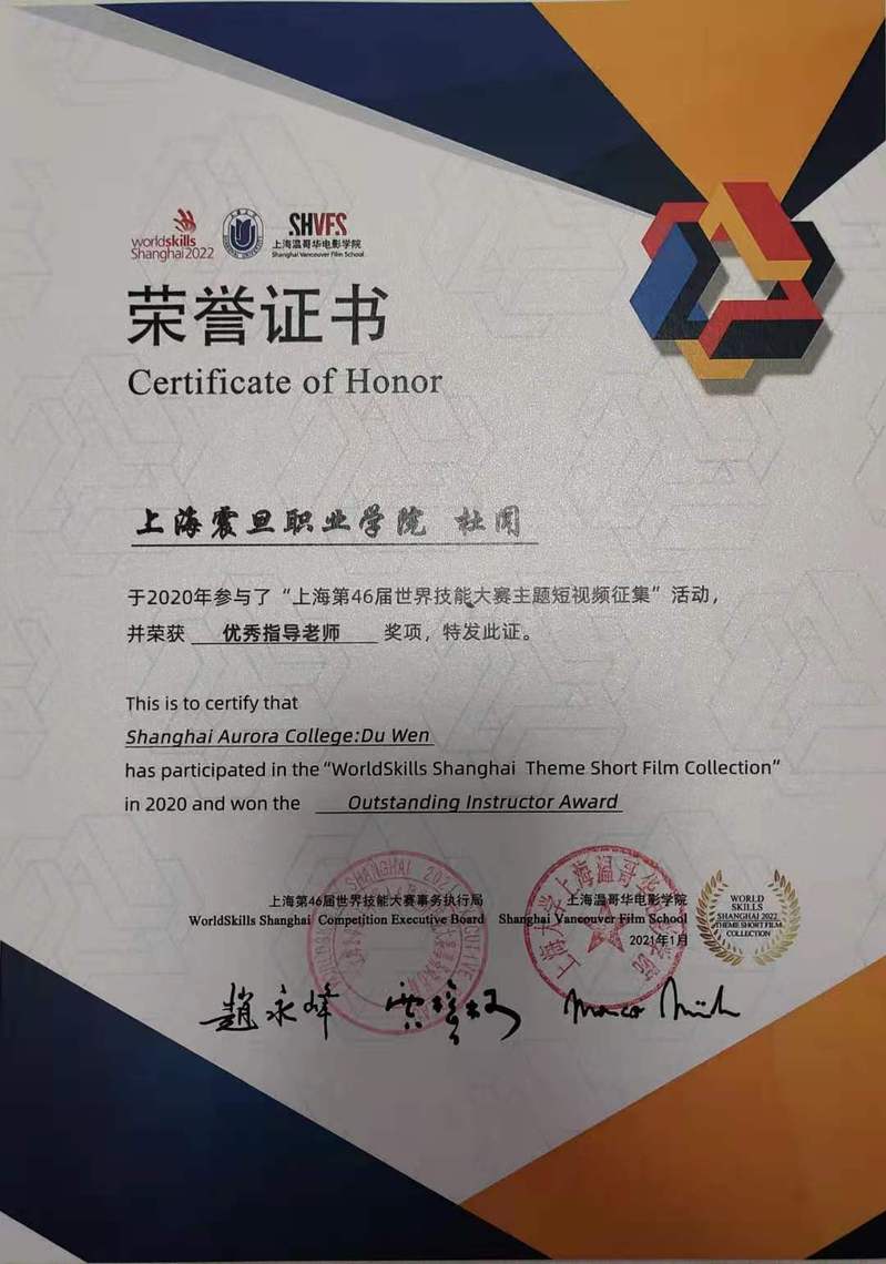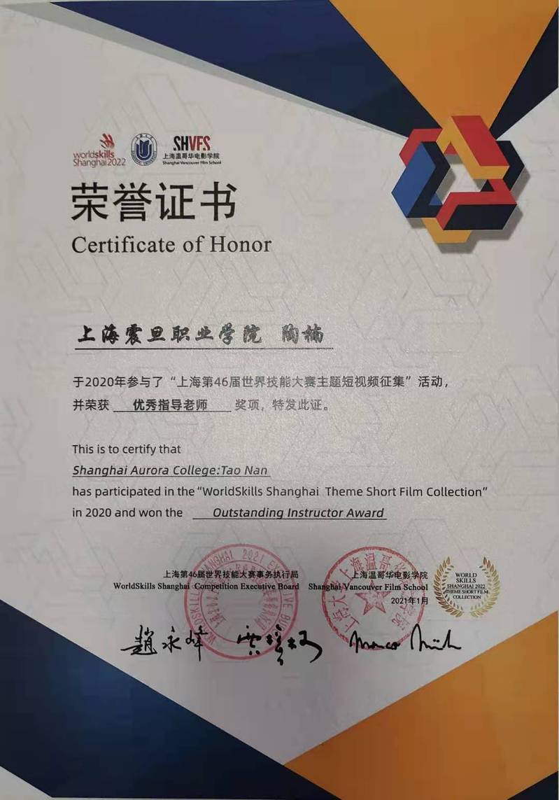 近日,我校在上海第46届世界技能大赛主题短视频征集活动中荣获“优秀组织奖”,东方电影学院杜闻、陶楠两位老师获“优秀指导老师”奖。