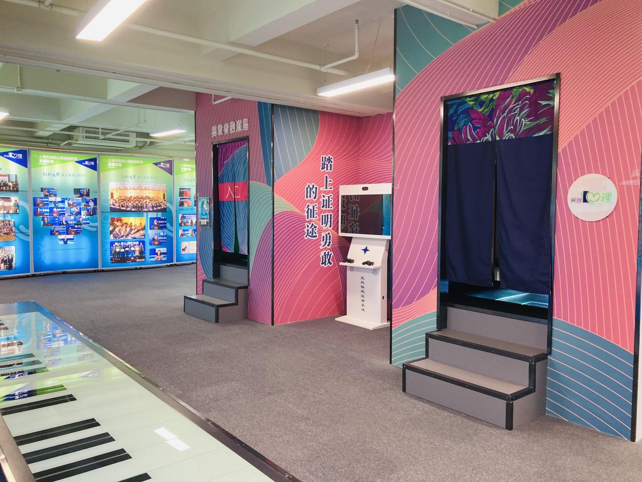 我校承建的上海市民办高校心理健康教育基地在“政府支持、专家领衔、高校参与、社会协同”的体系下,通过5年的建设,目前已形成以光影艺术,互动体验装置,智能化体验为核心,充满科技感,体验感;集艺术、科技、娱乐于一体的综合性体验中心;并建有“网络智能”自主心理健康教育系统,形成了集“展示、研究、交流、实训一体化”的综合性功能平台。拥有目前全国唯一一所心理健康教育专业馆。