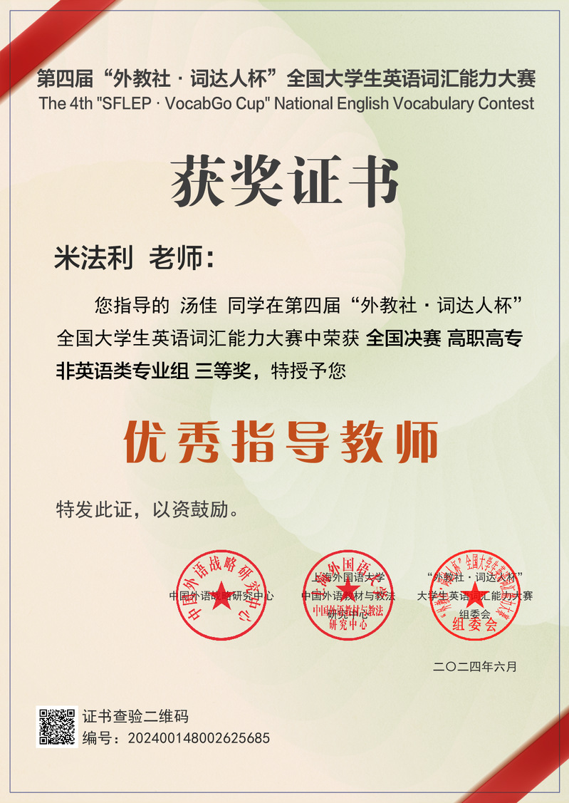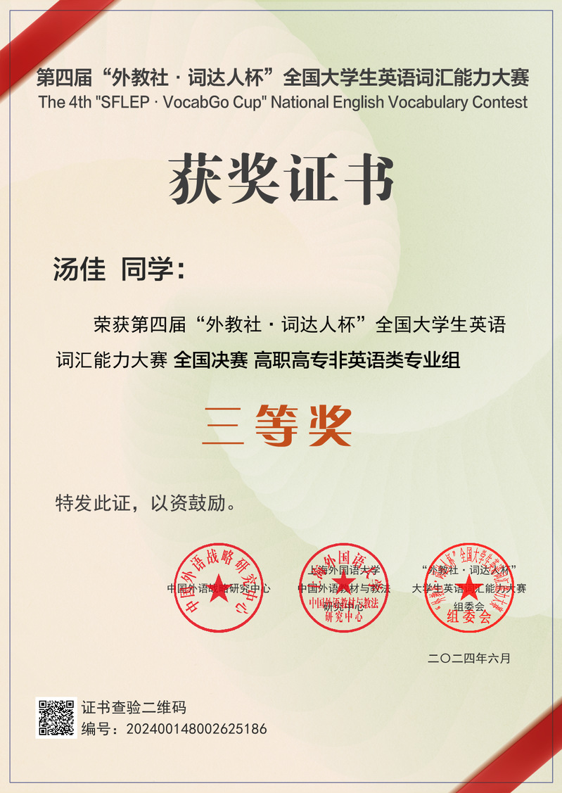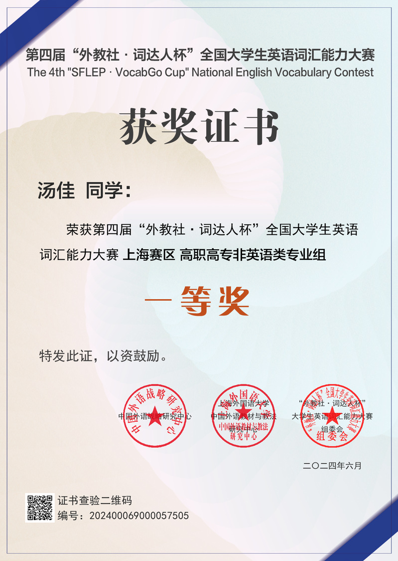 第四届“外教社·词达人杯”全国大学生英语词汇能力大赛全国总决赛落下帷幕,我校23级学前教育专业汤佳同学凭借扎实的语言功底,荣获高职高专非英语类专业组全国决赛三等奖;人文与教育学院米法利老师荣获“优秀指导教师”;我校荣获赛事上海赛区“优秀组织奖”。